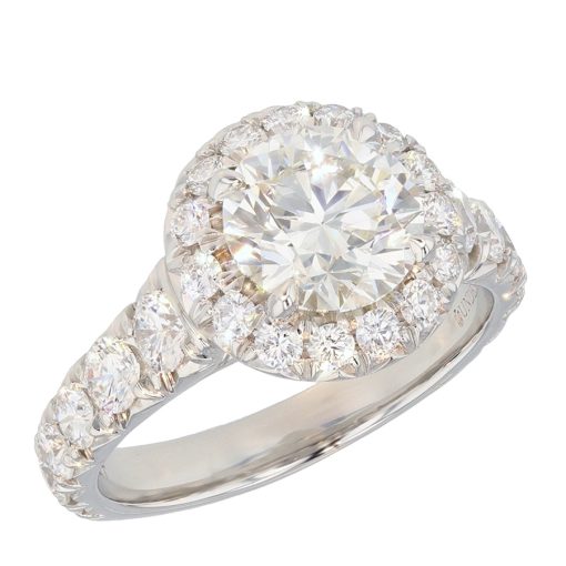 This ring is made in platinum and features a 1.71 carat round center diamond plus 1.30 carats total weight of fully cut halo and side diamonds. This is item DLFR1484