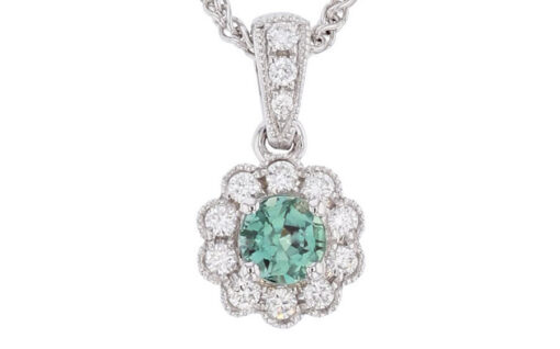 This necklace is made in 14k white gold and features a .23 carat round alexandrite plus .10 carats total weight of fully cut diamonds. This is item LDNC0172