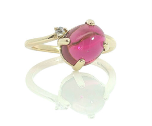 14K yellow gold ring featuring a 3.21 carat cabochon cut Pink Tourmaline and a 0.03 carat round diamond.