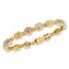 This Underwood’s custom bracelet is made in hammered and satin finished 18k yellow gold with platinum rivets. It features 13 multi colored opaque diamonds with a total weight of 26.3 carats. This is item UCD1384